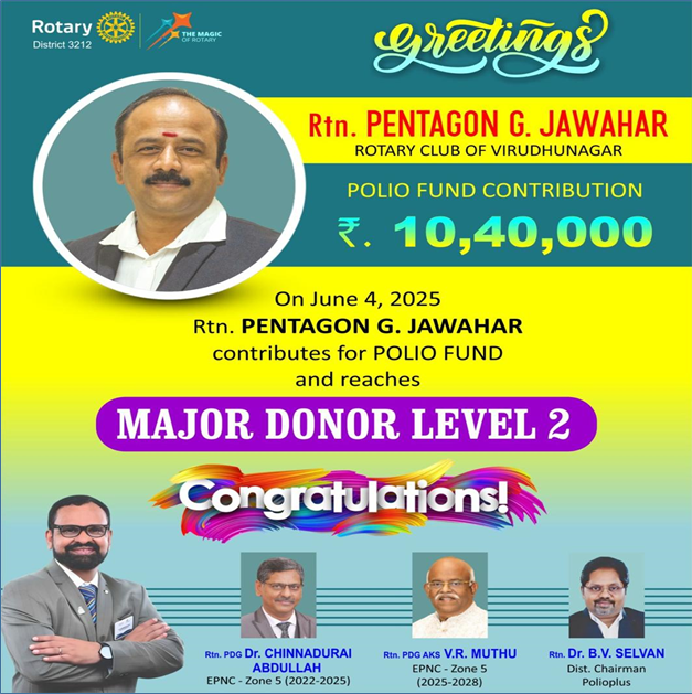 On June 4, 2025, Pentagon G. Jawahar, a distinguished member of the Rotary Club of Virudhunagar, made a generous contribution of ₹10,40,000 to the Rotary Polio Fund. In recognition of this outstanding act of service and generosity, Rotary International and the Rotary Club of Virudhunagar proudly honoured him with the prestigious title of:
